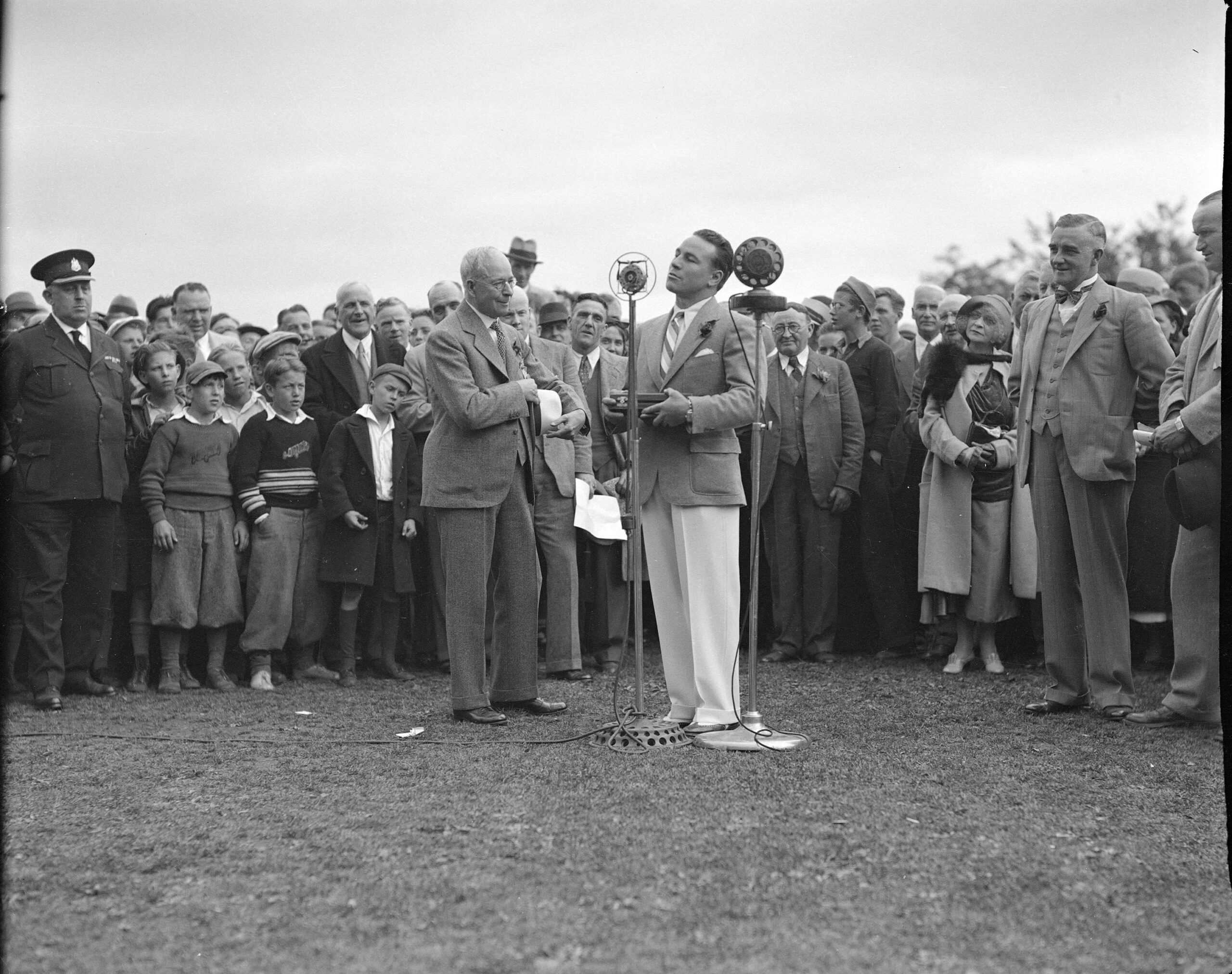 Jimmy McLarnin receiving key to the city from mayor L.D. Taylor during police sports. Photograph attributed to Stuart Thomson, City of Vancouver archives.