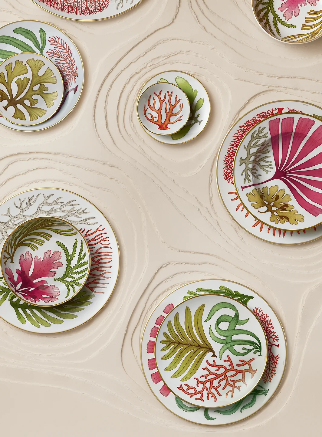 No two pieces are alike in the Hermès Natures Marines collection. After studying dried algae at the marine herbarium in London’s Natural History Museum, which holds more than 60,000 specimens, British illustrator Katie Scott hand-painted 100 plant species—sea fans, coral, samphire, and more. The designs—in shades of red, orange, green, and beige—are featured on 34 pieces of porcelain tableware.