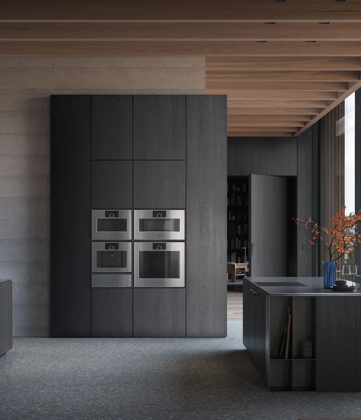 Mix and match any combination of appliances in Gaggenau’s Expressive series for a sleek and personalized culinary experience. Controlled by a floating metal ring with haptic feedback and a one-touch mechanism, its combi-steam and combi-microwave ovens, automatic coffee machines, and vacuum-sealing and dish-warming drawers are tucked away behind the brand’s heritage metalcraft and Bauhaus-inspired design.