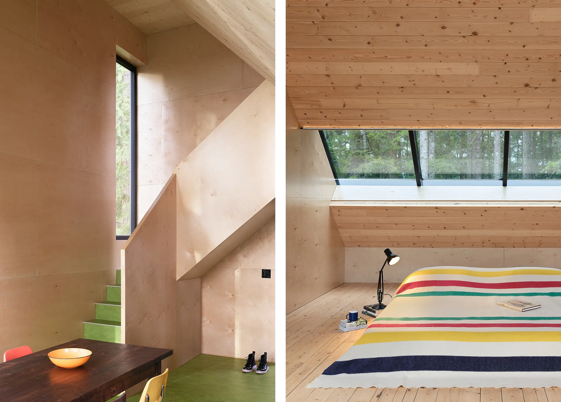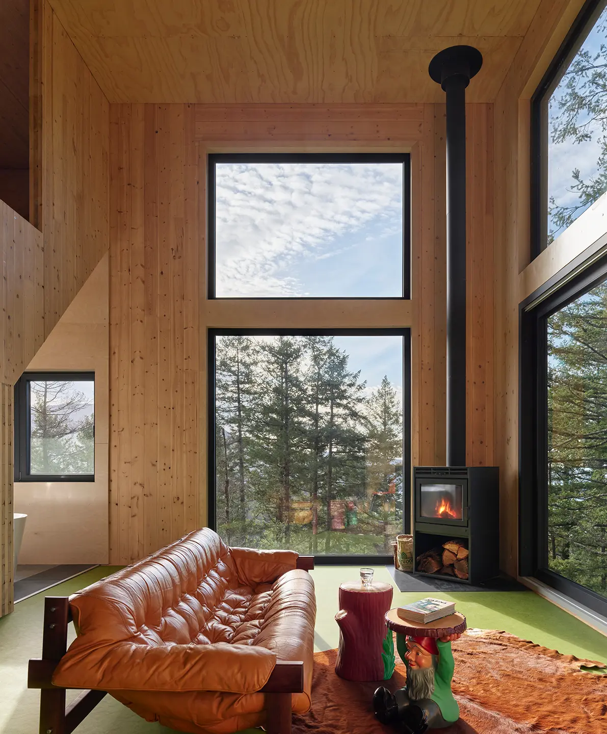 The interior of the house is all bright natural wood, made possible through cross-laminated timber panels—heavy cross-hatches of lumber that hold up the house without the use of steel beams. The cube section suspends a lounge and treetop bedroom above the cozy living area below, the exposed modernism of the walls contrasting with playful splotches of colour in 1970s style—moss-green linoleum and an autumn-orange leather couch—picked out by Andre and Sikorski. A wood stove, solar panels, incinerating toilets, and rainwater collection keep the house comfortable off the grid.