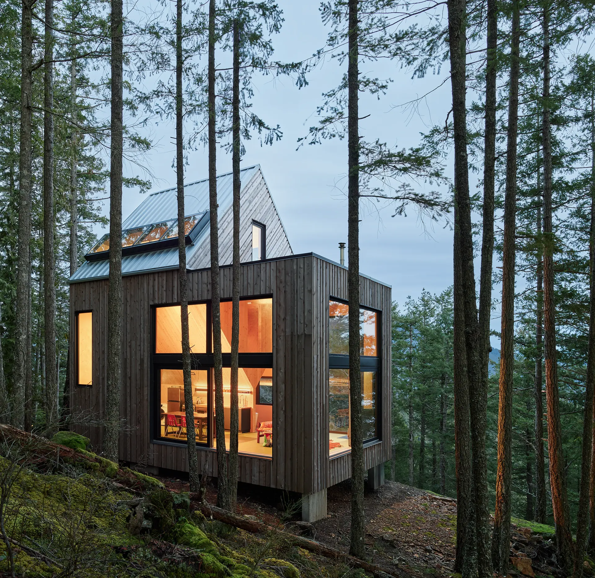 By the end of the first day, a box structure had emerged from the woods. On the second, the wind picked up, and half a dozen men struggled for an hour to place a swinging roof panel at the top of the cube, tethering it to the house like a kite. But by evening, it was done—the complete frame of the house peeking out of the mountainside, surrounded by a wave of untouched forest.
