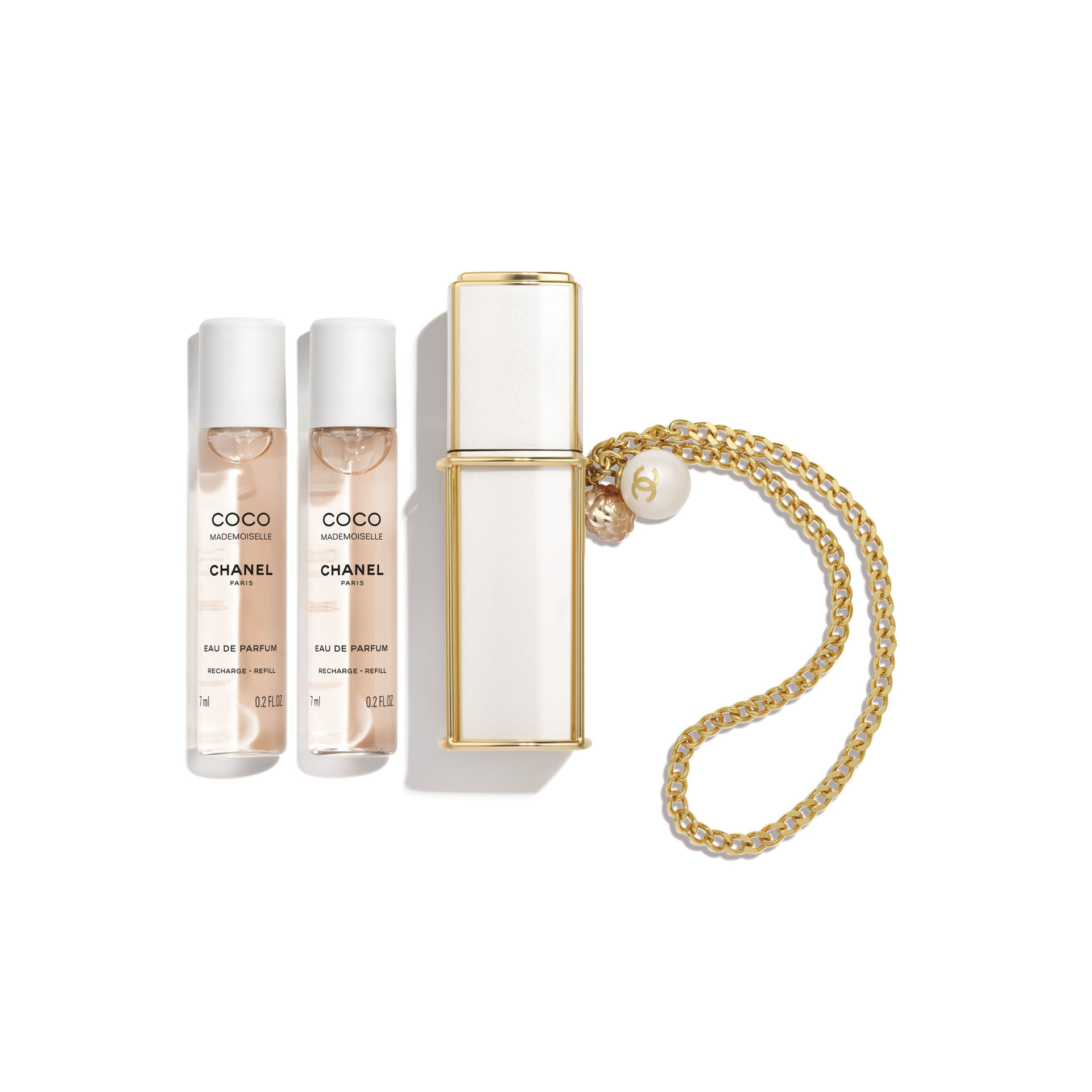 Chanel’s new Coco Mademoiselle purse spray captures spring in a bottle, adorned with a glass pearl and a camellia charm. Worn on the wrist like jewellery or as an accessory attached to your purse, the elegant case with golden chain strap offers on-the-go, fresh, amber fragrance all day long.